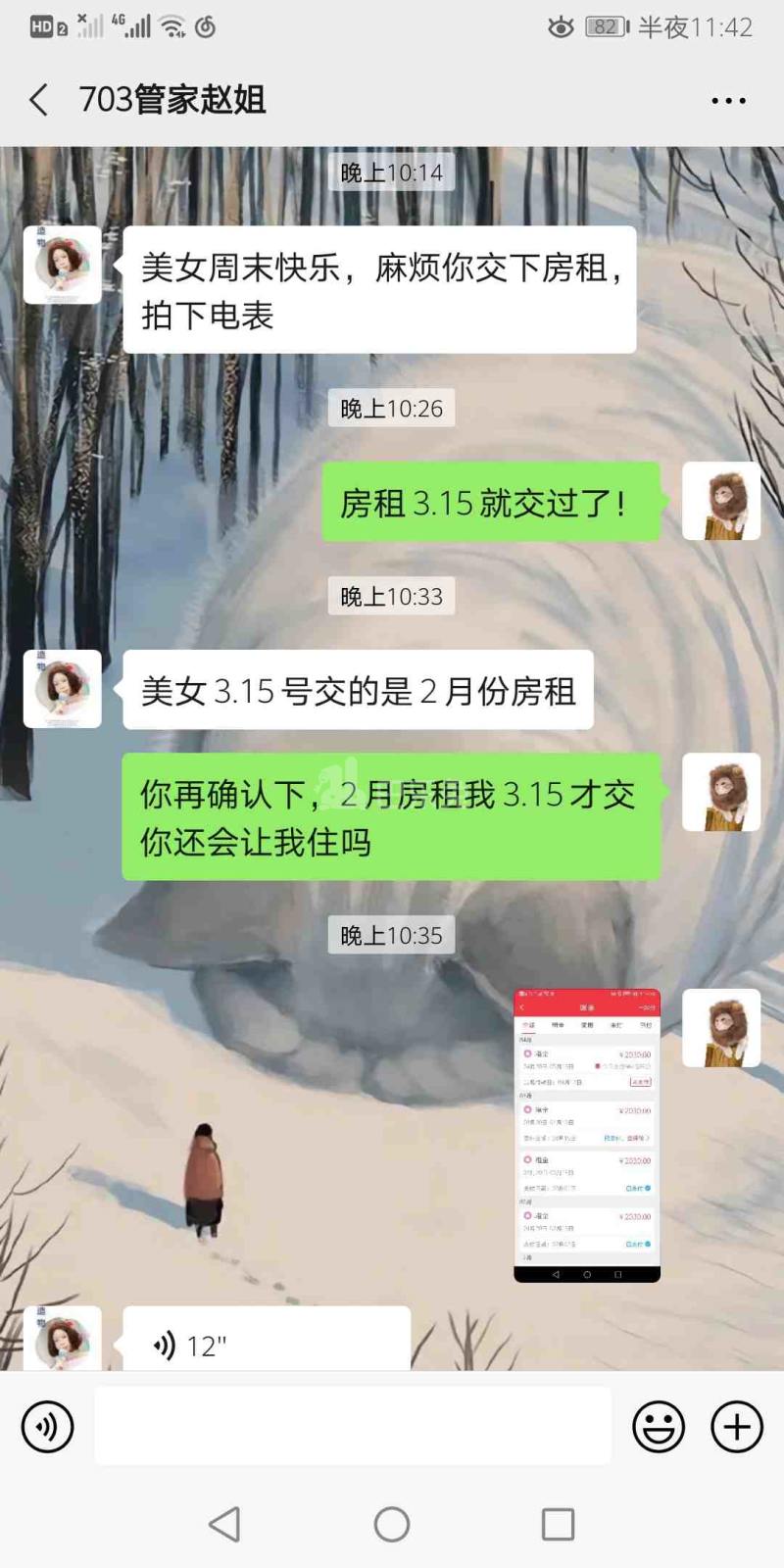 设施环境 : 3.15已在平台交过3月份房租,3.22房东还在微信私聊问我要房租,房租我都会直接平台支付,麻烦以后不要让房东再单独找我要房租!真的很烦人!
